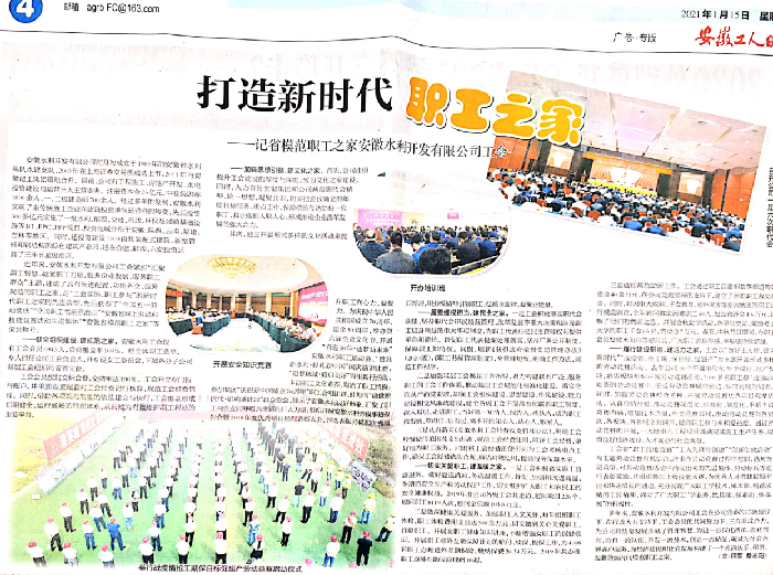 编者按:2021年1月15日,安徽工人日报以《打造新时代职工之家——记省模范职工之家安徽水利开发有限公司工会》为题,刊发了安徽水利工会获评安徽省模范职工之家的深度报道,对安徽水利工会围绕中心、服务大局,加强自身建设,推动企业高质量发展等方面的经验做法给予了重点推介。