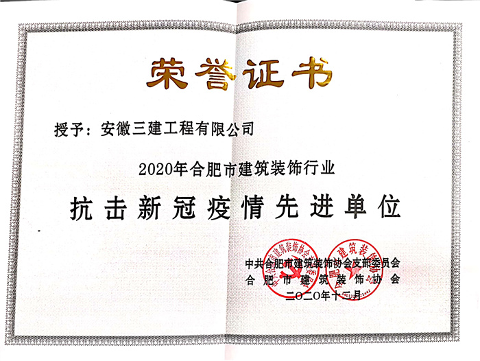 近日,经合肥市建筑装饰协会评选,安徽三建公司被授予2020年度“合肥市建筑装饰优秀企业”和“合肥市建筑装饰行业抗击新冠疫情先进单位”称号。安徽三建公司已经连续多年获“合肥市建筑装饰优秀企业”荣誉。由于在抗击疫情中的突出贡献,此前公司已获得“安徽省抗击新冠疫情先进集体”“全国住房和城乡建设系统抗击新冠肺炎疫情先进集体”称号。