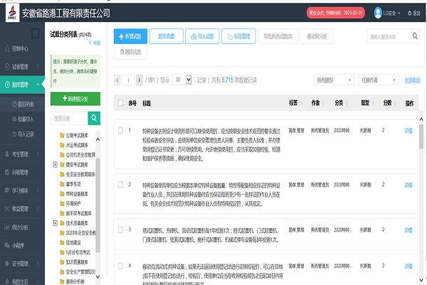 通过使用线上平台,建立包含特种设备、环境保护、驻地建设、节后复工、疫情防控、岗前考试、全员安全教育等11类、5715道试题的题库,安全教育不再受时间和距离制约,近年来安全教育频率大幅度提升。