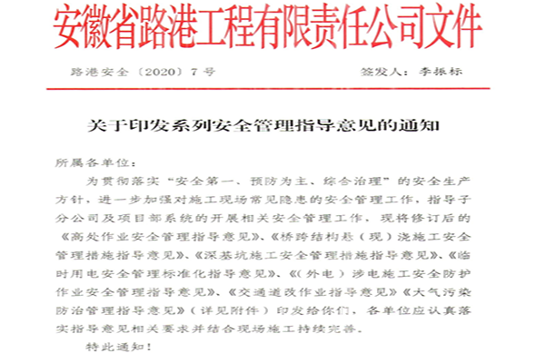 “十三五”期间,公司进一步细化安全管理要求,印发《设备操作规程》《安全设施标准化图集》,编制下发了高处作业、桥跨结构悬(现)浇施工、深基坑施工、临时用电安全管理标准化、(外电)涉电施工安全防护、施工现场车辆交通、大气污染防治管理、安全应急管理等系列指导意见,指导施工现场开展安全管理工作,目前均得到有效落实。
