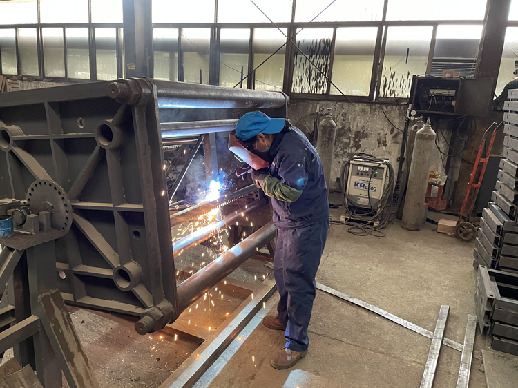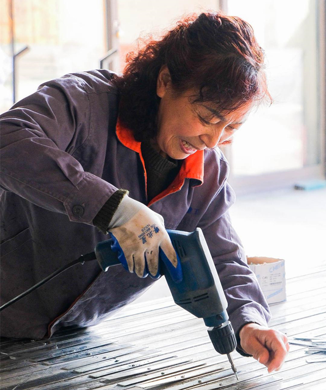 门窗公司女工王来菊在车间工作区域进行材料加工工作,为抢门窗生产进度