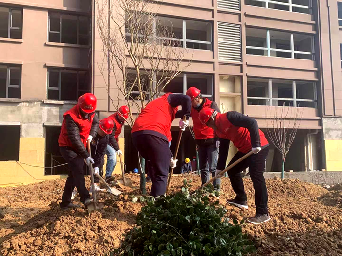 沛县支部联合安徽一建组织开展植树活动。3月12日,团员青年前往安建地产·汉城源筑书香苑园林景观处,分工协作——搬运树苗、挖坑放树苗、填土踏实,最后浇水灌溉,小心仔细地为春天增上一抹生机。在大家共同辛勤劳动下,书香苑园林景观处裸露的黄土上多了一颗颗小树苗,为明媚的春光又增添了一份绿意,更显生机勃勃。此次活动中全体参与人员亲手栽种树苗,增强了爱树护树的意识,强化保护环境、爱护家园的环保观念。