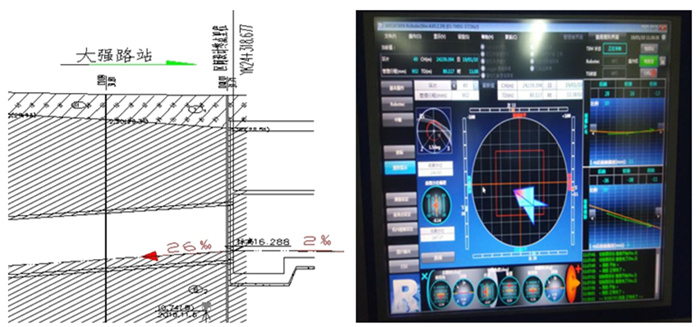 严控盾构始发姿态。盾构始发姿态决定了后续施工成败,是盾构施工重中之重。考虑到盾构机自身重心靠前,始发掘进时易产生向下的“磕头”现象,项目部将盾构始发轴线比设计轴线抬高20mm。此外,因车站底板自西向东为2‰纵坡,盾构进洞为26‰下坡。按照一般状况抬高始发轴线易导致侵限。项目查找合肥市轨道交通前期其他盾构隧道施工的经验,结合大强路站地质情况,调整盾构始发轴线,将盾构始发轴线抬高改为5‰下坡,有效避免了盾构管片侵限。