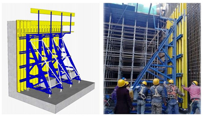 采用定型化模板施工。传统国内地下工程模板支架多采用钢管架(或碗扣架)+木模板的形式,人材机投入大,安拆周期长,而且搭设过程中控制细节多,质量不易保证,安全风险大。为此轨道交通项目侧墙施工采用大胶合板+木工字梁+桁架支撑的单侧模板台车体系。其组装简便,利于现场快节奏的流水施工;整体承载力较大,能抵抗不同混凝土侧压力;可变高度,可适应不同墙体高度;可利用小型轮车进行整体转移,节省现场塔吊台班量;采用在板上预埋锚固装置,侧墙上无需预埋,可完全实现清水墙效果。据统计平均每块墙板缩短工期约10天。在保证质量的同时极大缩短工期。