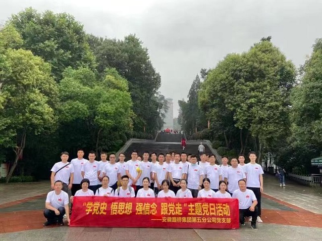 为纪念中国共产党成立100周年,全面深入落实好党史学习教育,推进支部的组织建设,激励全体党员继承和发扬党的优良传统和作风,进一步增强基层党组织的凝聚力、号召力和战斗力,安徽路桥集团第五分公司党支部于6月26日到达有“红军的摇篮、将军的故乡”之称的金寨县,以“学党史 悟思想 强信念 跟党走”为主题,瞻仰革命先烈,重温入党誓词,接受革命传统教育。五分公司全体党员、积极分子等40余人参加此次活动。