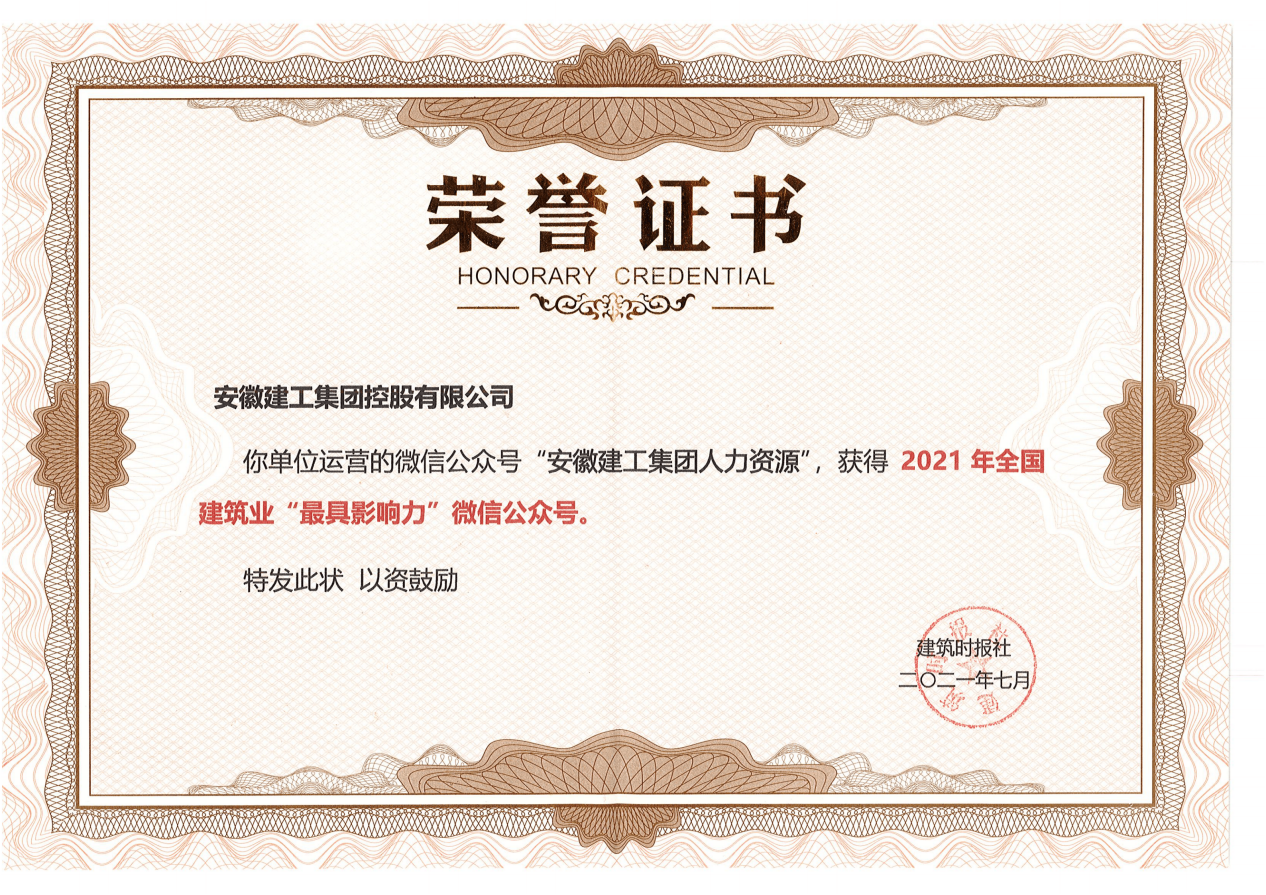 7月15日至17日,由建设部所属建筑时报社主办的2021年建筑业微信公众号运维经验交流研讨会暨2021年全国建筑业优秀微信公众号颁奖典礼在扬州召开。“安徽建工集团人力资源”微信公众号荣登“2021年全国建筑业最具影响力公众号”榜单。