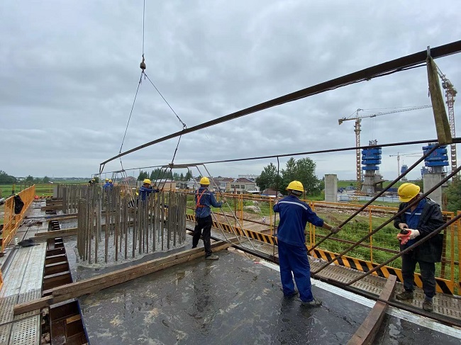在开工前,项目部精心组织,合理安排。相关技术人员进行了支撑平台的的专项验收,科学布控施工组织,在原材、配合比、运输、布料方法、浇筑速度等环节严格把控,安排专人全程监测支撑平台。由于受场地地基基础限制,施工难度较大,项目部技术人员克服困难、潜心钻研,反复验算推演,采用穿心棒法进行施工。在浇筑过程中,工人协作紧密,有条不紊地进行盖梁浇筑作业,技术人员密切关注浇筑过程中的每个细节,认真指导,及时优化调整施工中出现的问题。