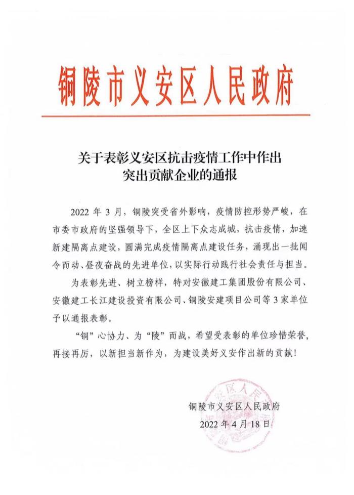 近日,安徽建工和长江建投获铜陵市义安区人民政府通报表彰。通报指出,安徽建工和长江建投等先进单位积极响应铜陵市委市政府号召,闻令而动昼夜奋战,圆满完成疫情应急隔离点建设任务,以实际行动践行省属国企的社会责任与担当。