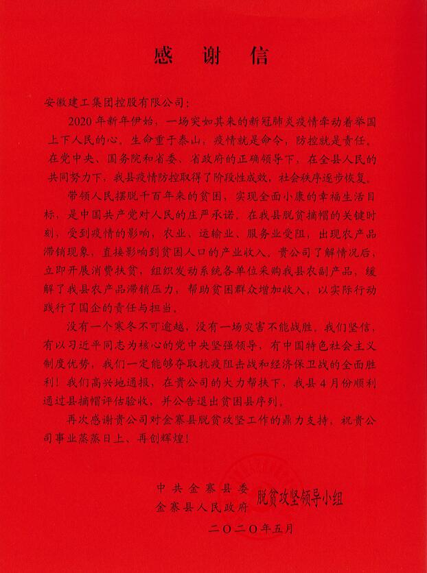 近日,集团收到中共金寨县委、金寨县人民政府脱贫攻坚领导小组的感谢信,对集团在疫情期间大力开展消费扶贫,帮助金寨县解决农副产品滞销问题的义举给予了高度评价和衷心感谢。