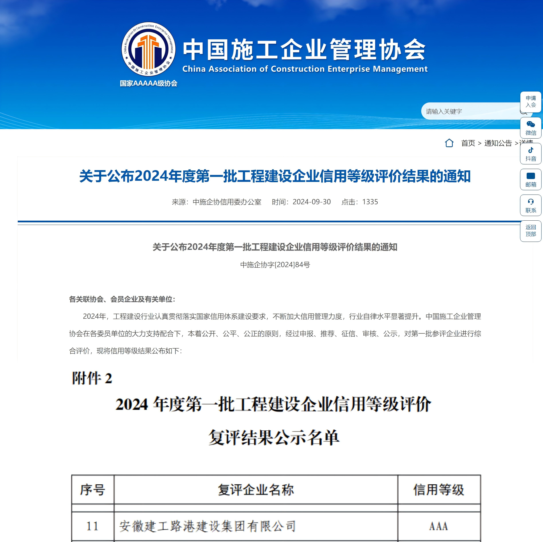 近日,中国施工企业管理协会传来喜讯,公司成功通过2024年度的“AAA”信用复评。