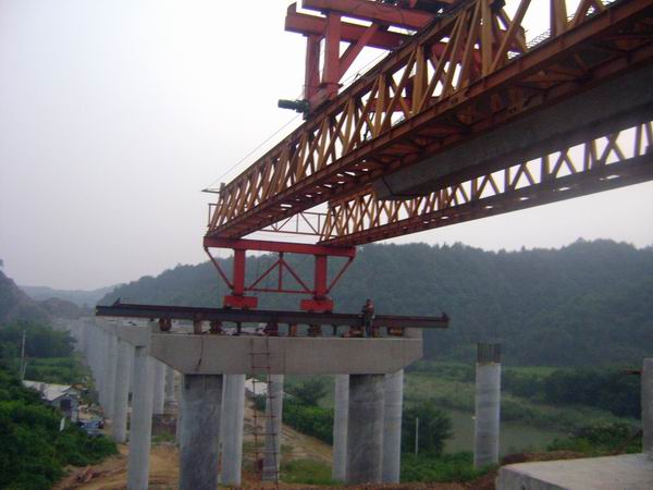 该桥左幅17跨,右幅16跨,为25 m先简支后连续预应力砼小箱梁,全桥共有箱梁132片,最大安装重量75t。采用1套QD100T/30m架桥机,依次进行K10+236.75大桥左右幅箱梁安装,箱梁采用运梁炮车运输。桥体处于本标段标尾与02标接头,横跨大源河,交通不便,各种物资到达及站内调车作业极为困难。为确保安全、优质地完成这次铺架任务,项目部精心组织,做好准备工作,协调好各项事宜,制定了详细、切实可行的架梁方案。