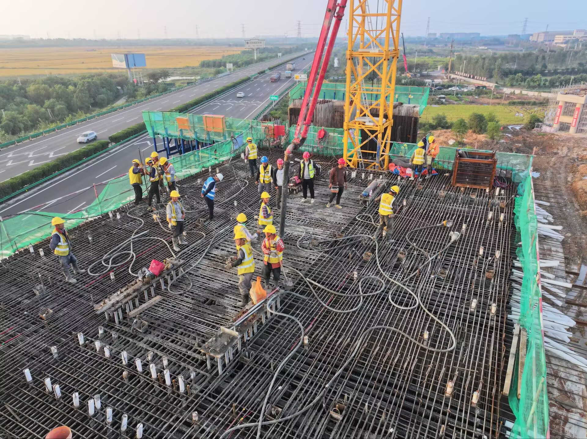 悬浇箱梁位于本项目丰乐枢纽主线特大桥主桥,采用45m+84m+45m跨径,上跨G3京台高速,导致项目施工难度大。项目部高度重视各施工环节,精心组织、超前谋划,并多次召开现场会,从施工工艺、安全管控、质量控制到应急保障措施等多方面进行周密部署,项目一线人员轮班坚守、攻坚克难,确保浇筑过程中安全质量有序可控。
