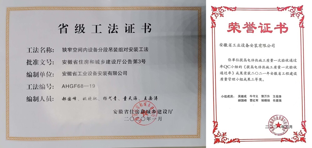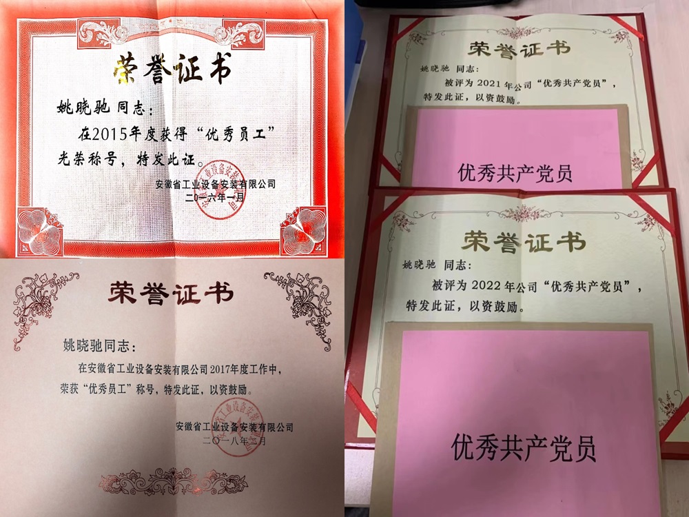 在繁忙的工作之余,姚晓驰对专业知识的探索与热爱从未有片刻停歇。他仿若一位求知若渴的行者,积极主动地在知识的海洋中破浪前行,持续拓宽并深化自身的知识体系。他参与研发的《狭窄空间内设备分段吊装组对安装工法》成功荣获安徽省住房和城乡建设厅颁发的省级工法称号,《提高电伴热施工质量一次验收通过率》也荣获了安徽省工程建设质量管理小组成果三等奖。
