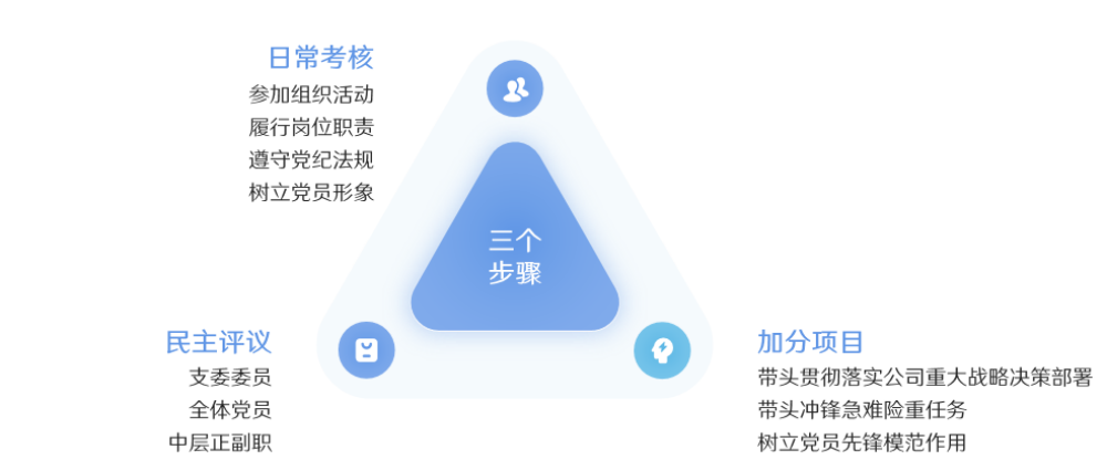 遵循“实事求是、立足岗位、奖优罚劣、民主公开”的原则,设置日常考核、民主评议和加分项目三个部分,对党员综合表现进行客观评价。其中,日常考核聚焦参加组织活动、履行岗位职责、遵守党纪法规、树立党员形象四个主要方面,设置扣分项目,对党员履行基本义务提出明确要求。加分项目重在激励党员干部带头贯彻落实公司重大战略决策部署、带头冲锋急难险重任务,树立党员先锋模范作用。