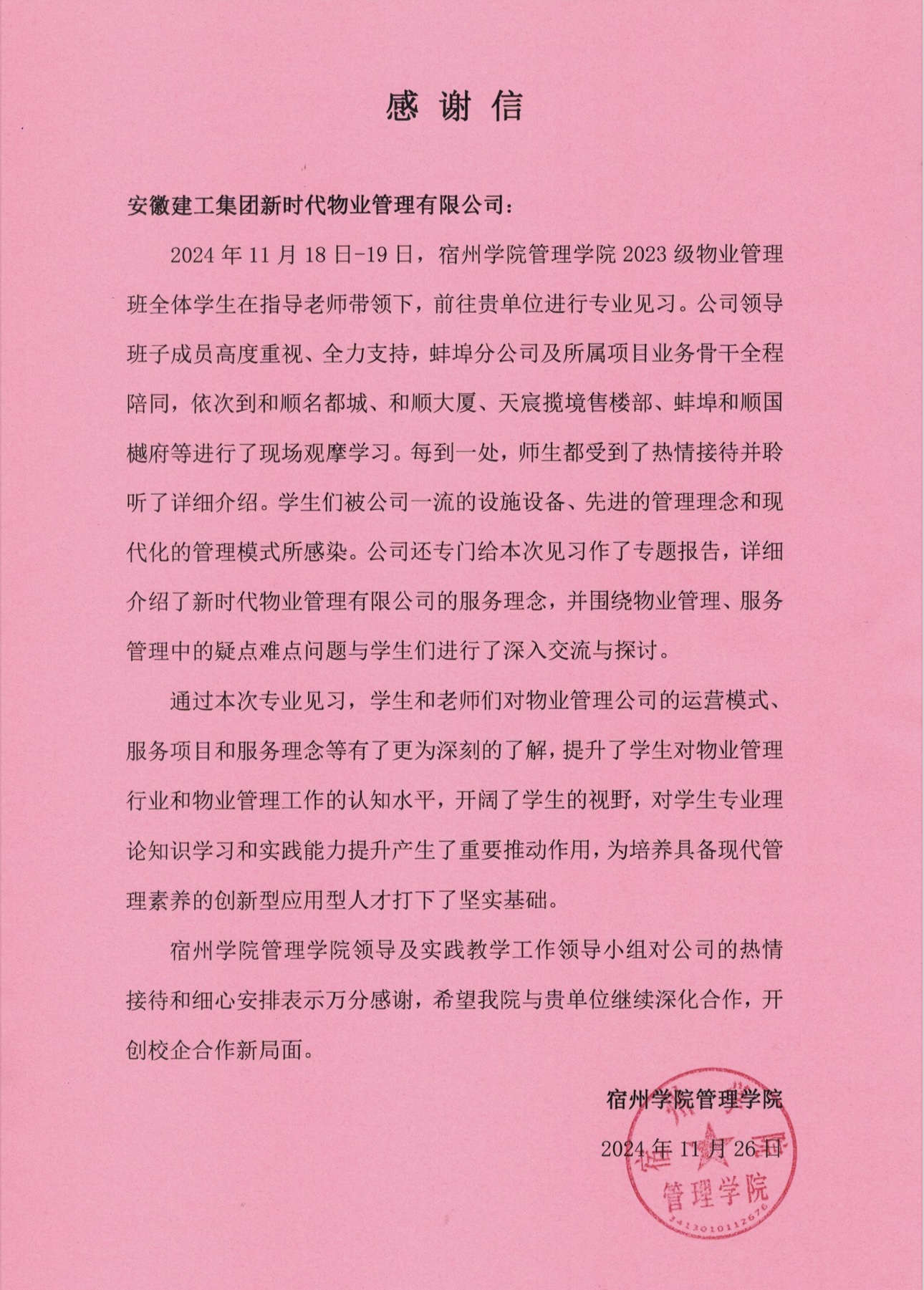 近日,物业公司荣幸收到来自宿州学院管理学院的感谢信。信中,管理学院对物业公司在专业见习中的热情接待与精心安排表达了深切谢意。