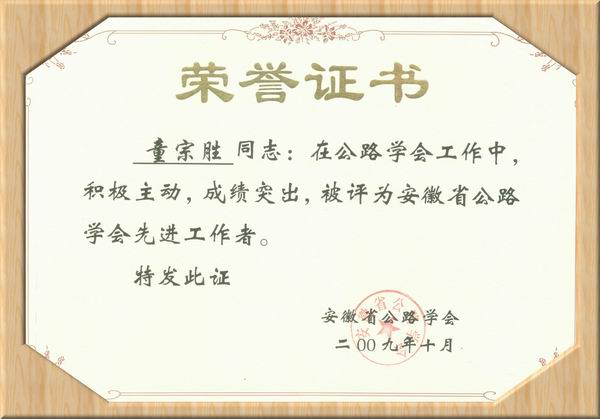 从近日结束的安徽省公路学会成立30周年庆祝大会传来好消息,公司董事长、总经理童宗胜荣获安徽省公路学会“先进工作者”称号。大会向童董事长颁发了获奖证书。