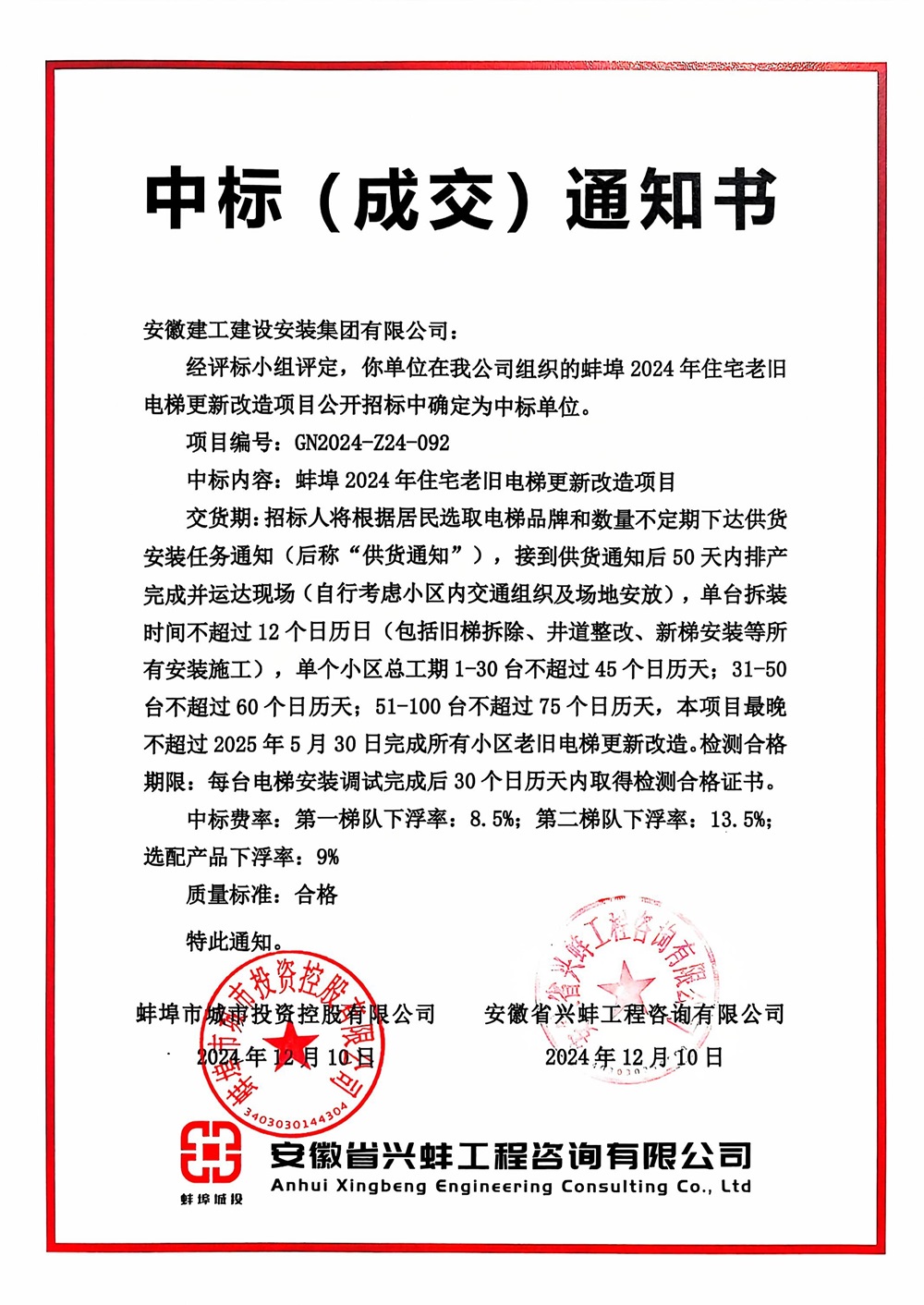 12月10日,建工安装电梯分公司成功收到蚌埠2024年住宅老旧电梯更新改造项目中标通知书!