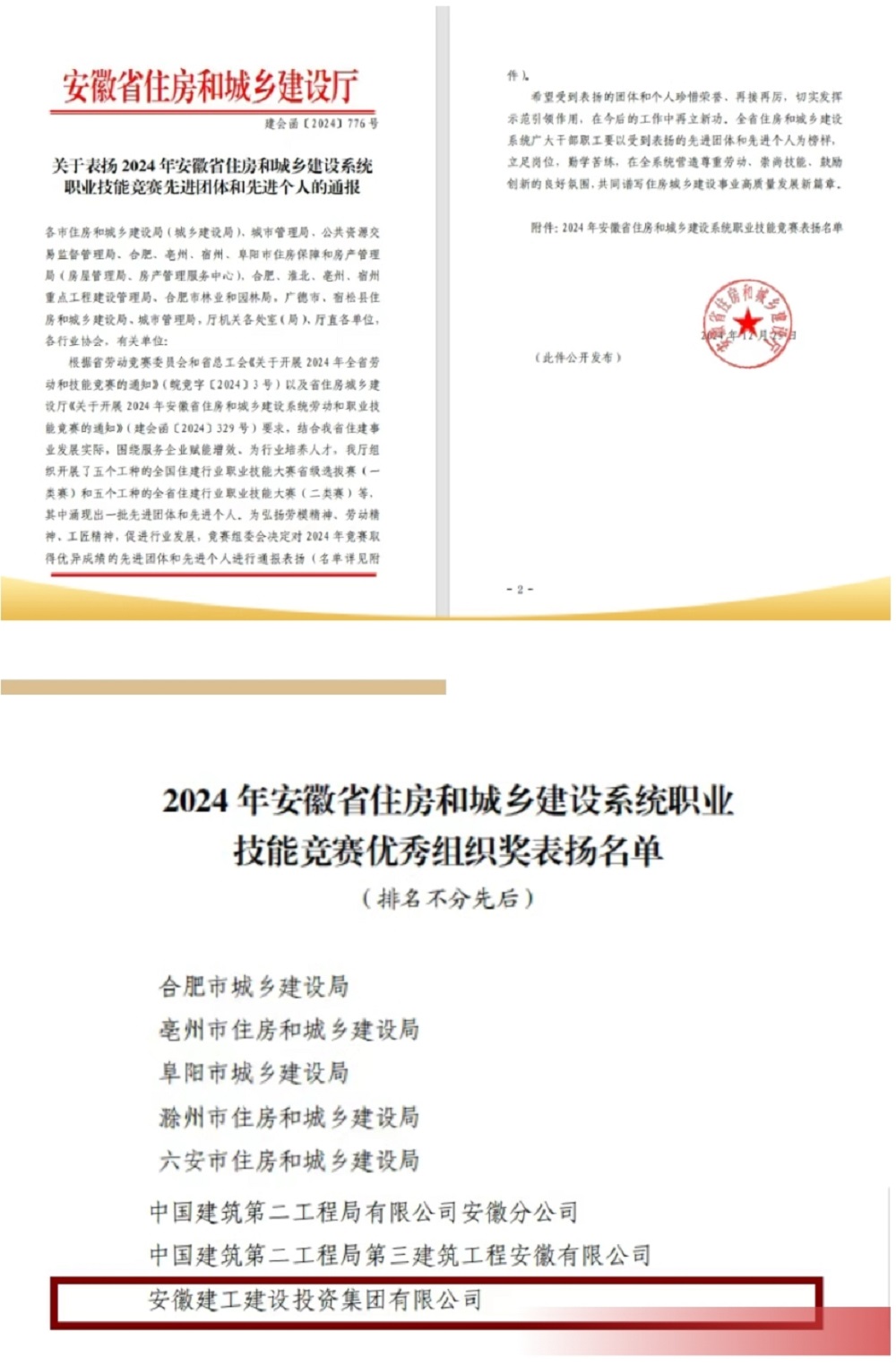 近日,安徽省住房和城乡建设厅发布《关于表扬2024年安徽省住房和城乡建设系统职业技能竞赛先进团体和先进个人的通报》,对2024年竞赛取得优异成绩的先进团体和先进个人进行通报表扬。其中,建工建投集团喜获优秀组织奖!另4名员工喜获先进个人表扬。