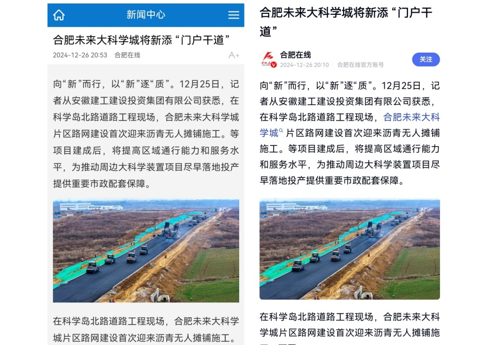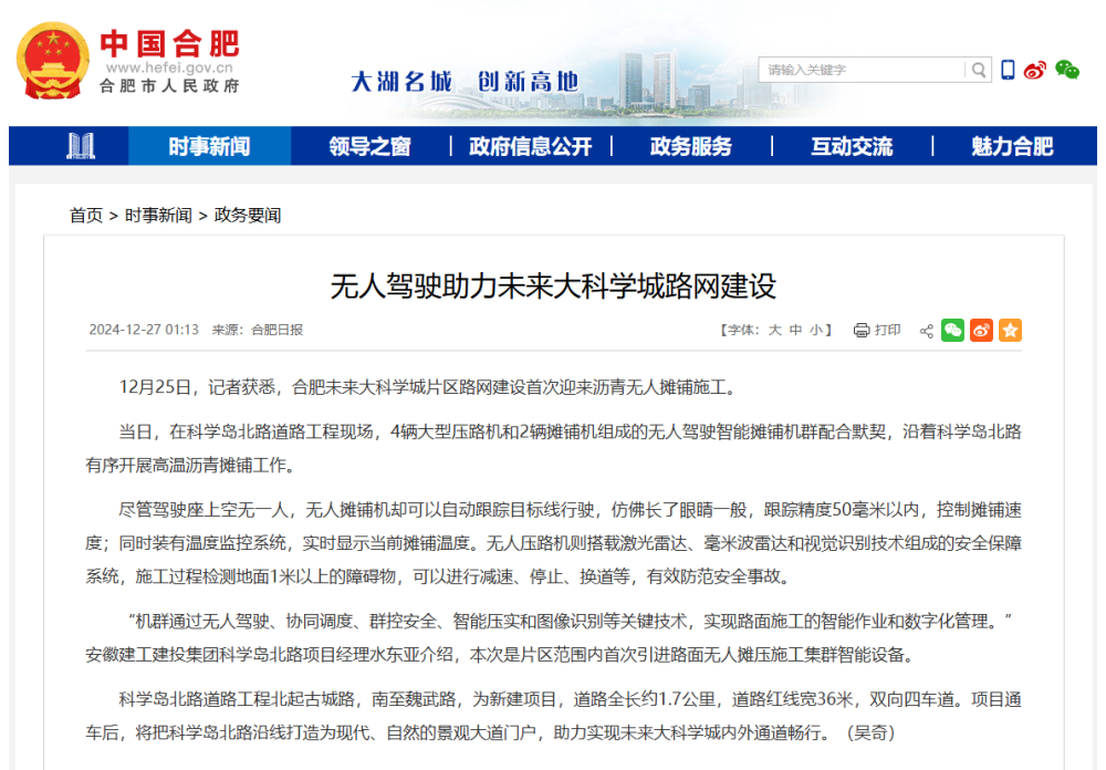 12月25日,建工建投集团合肥市科学岛北路等4条道路工程项目沥青下面层无人摊压施工顺利进行。《合肥日报》、合肥在线等媒体深入项目一线展开报道,稿件登上合肥市政府官网首页。