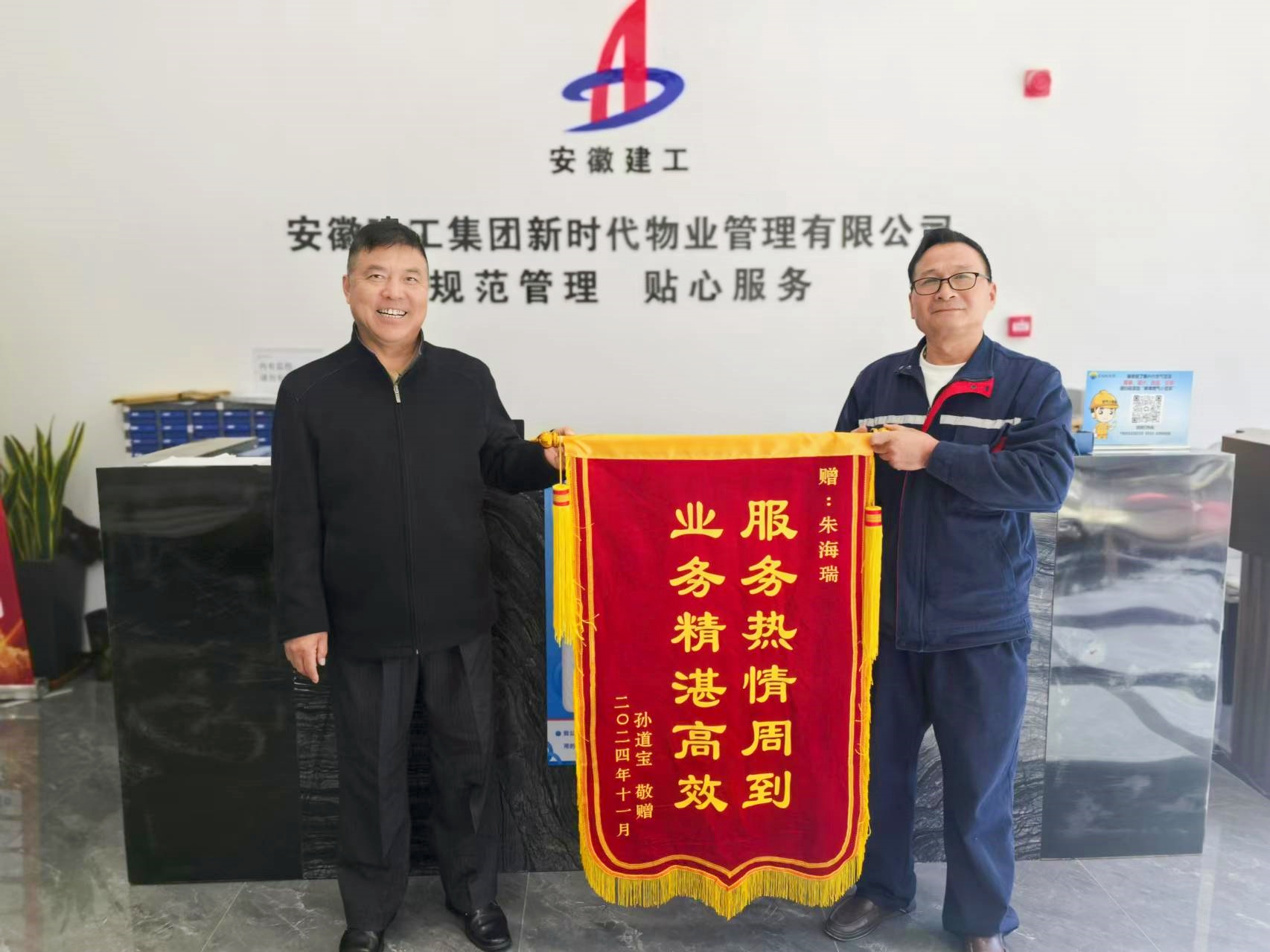 近日,17-403的业主满怀感激地将一面写有“服务热情周到,业务精湛高效”的锦旗送到了物业服务中心,亲自交到了朱海瑞师傅的手中,这背后是朱海瑞师傅日复一日的辛勤付出。