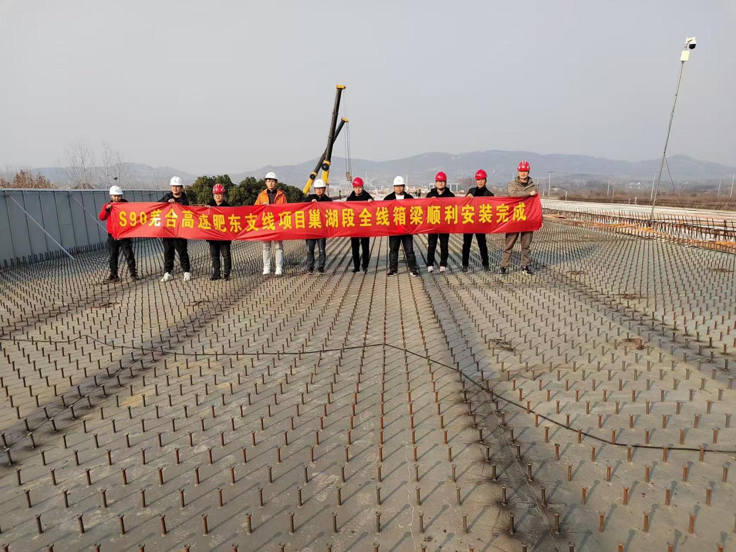 近日,随着最后一片25m箱梁吊装成功,建工路港S90芜合高速肥东支线巢湖段全线梁板架设已圆满完成,为项目按期通车目标奠定基础。