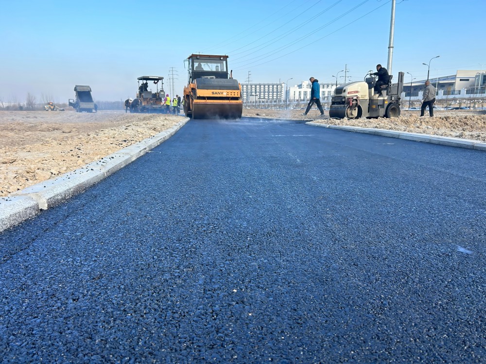 下塘临时商业街项目的沥青摊铺工作正在进行。现场大型运料车与沥青摊铺机默契配合,一前一后,正在进行紧张作业。沥青摊铺机驶过,厚厚的沥青便铺在了路面上,施工人员紧跟其后,对铺设的沥青进行整理、测量,同时后方还有多辆压路机来回作业,对刚刚铺设的沥青进行稳固压实,呈现一派热闹的施工景象。