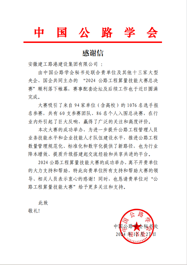 近日,中国公路学会向公司发来感谢信,感谢公司在“2024公路工程算量技能大赛总决赛”活动中所做出的积极贡献。在此次全国算量大赛活动中,公司积极筹备,开展预赛选拔及过程培训,最终参赛学员取得了优异的成绩。