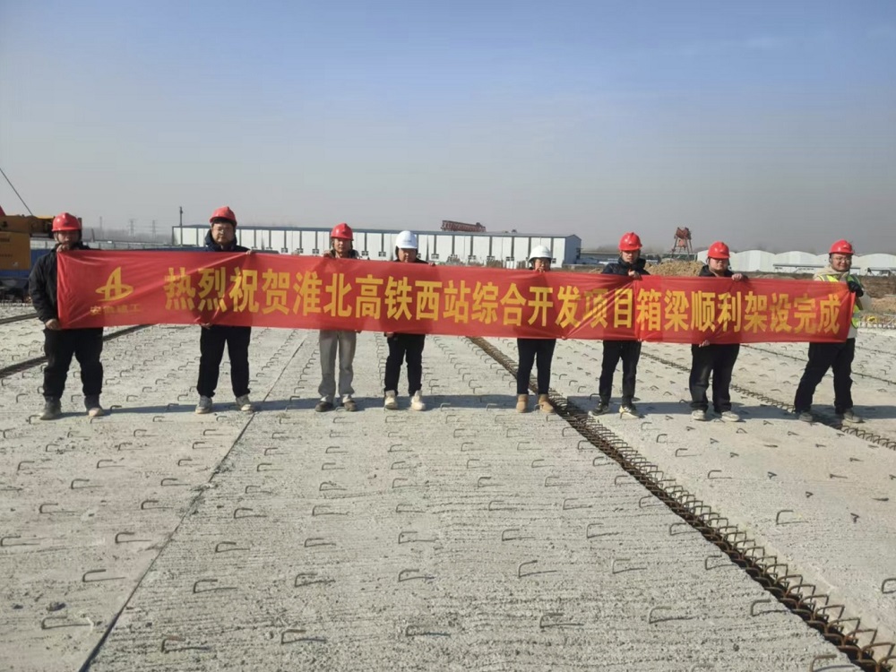 1月8日上午,淮北市高铁西站综合开发项目顺利完成纬五路跨刘河沟桥箱梁架设。
