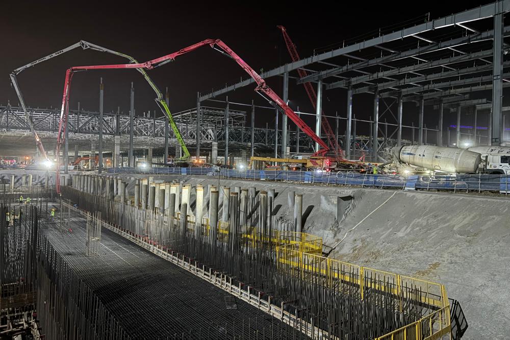 2024年9月8日22时35分,经过28小时的持续鏖战,大众产业园项目 13144方大体量混凝土浇筑任务,比预定计划提前8小时完成,本次浇筑投入搅拌车140辆,泵车13台,是建工建材在合肥地区,体量最大、用时最短的一次浇筑任务。