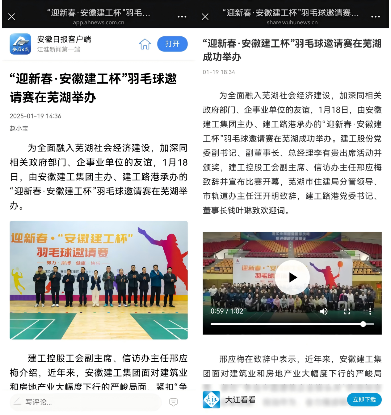 日前,安徽日报、大江看看等省市级媒体专题报道了由建工路港承办的“迎新春·安徽建工杯”羽毛球邀请赛,共同见证了建工路港同芜湖属地个相关政府部门、企事业单位的友谊之赛。