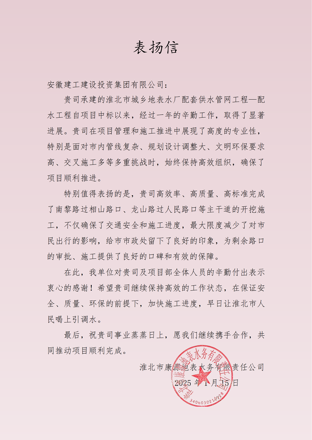 近日,建工建投集团淮北供水管网项目部收到业主单位淮北市康源地表水务有限责任公司发来的表扬信,信中对项目部全体成员的辛勤付出和专业管理能力给予高度评价,并对项目在关键节点的高效推进表示由衷感谢。