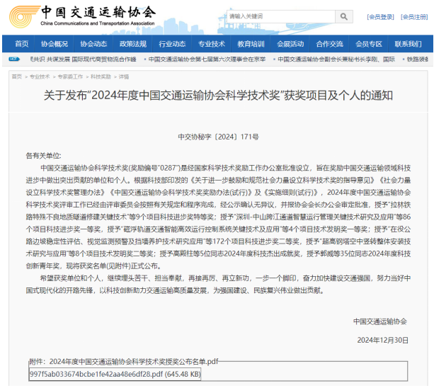“中国交通运输协会科学技术奖”是由国家科学技术奖励工作办公室批准设立,旨在奖励中国交通运输领域中做出突出贡献的单位和个人,是国家科技奖励的重要组成部分,被业内誉为“全国交通运输行业最高科技奖”。