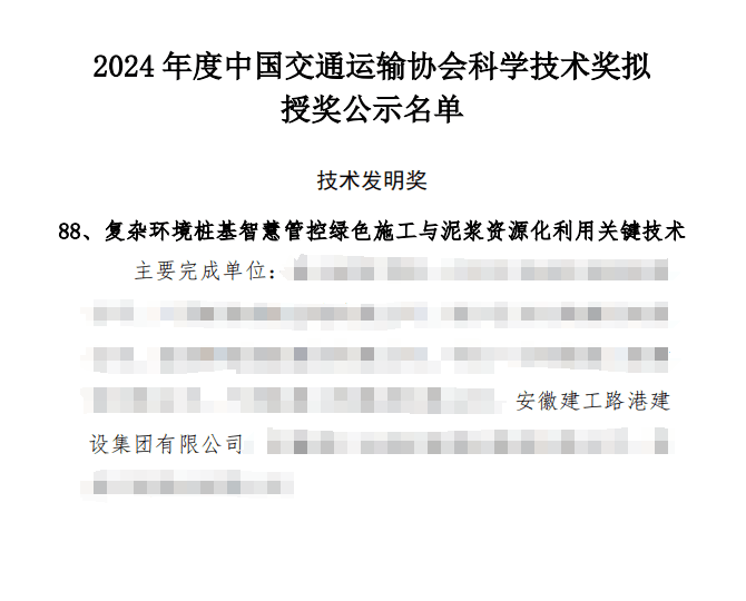近日,中国交通运输协会公布了2024年度科学技术奖获奖名单,建工路港“复杂环境桩基智慧管控绿色施工与泥浆资源化利用关键技术”荣获技术发明奖一等奖。