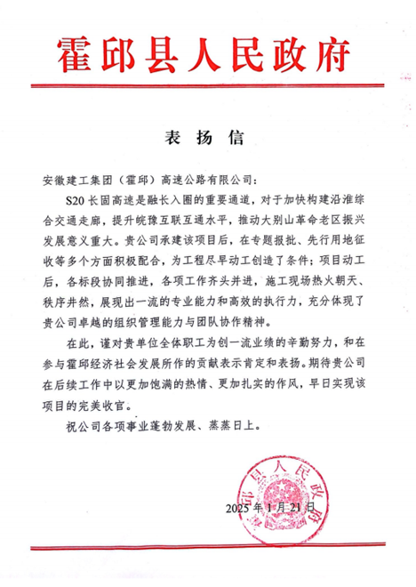 1月24日,建工投资S20长固高速霍邱至皖豫界段项目喜获霍邱县人民政府通报表扬,充分肯定了项目公司在前期工作推进方面取得的丰硕成果。