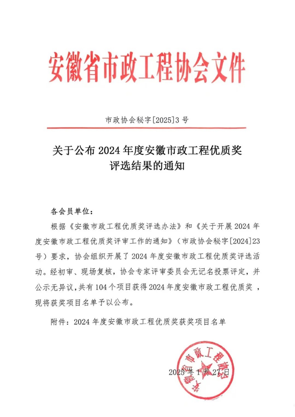 2025年1月27日,安徽省市政工程协会发布文件《关于公布2024年度安徽市政工程优质奖评选结果的通知》,由建工建投集团主申报的肥东经开区火龙山路(魏武路-东方大道)建设工程,白马山路(学林路-关井路)等三条道路建设工程,新站高新区青龙山路(梅冲湖路-荃湖北路)道路工程,新站高新区鹤翔湖路等五条路工程施工、城市排水管网改造(二期)工程,灵璧县迎宾大道(凤河至汴河路段)、奇石大道(滨河路至凌山路段),汴河路(迎宾大道至薄山路段),合庐产业新城龙桥路等8条市政道路工程施工-2标段,灵璧县城市路网PPP项目一期(调入部分)工程-凤山大道等共计8个项目荣列获奖名单!