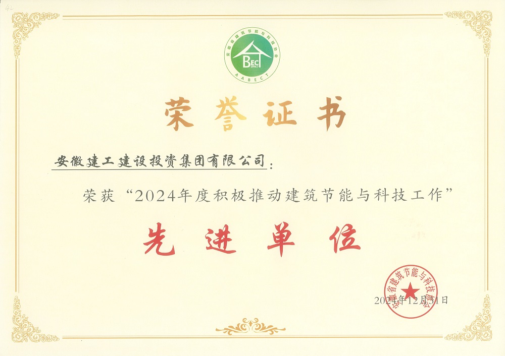 近日,建工建投集团喜获安徽省建筑节能与科技协会颁发的“2024年度积极推动建筑节能与科技工作先进单位”称号。