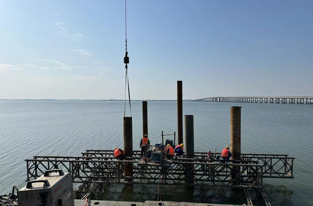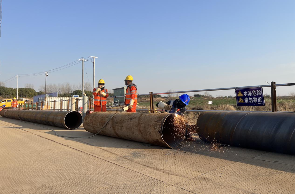 2 月 6 日,城东湖西岸拌合站钢筋大棚基础开挖、上料口模板拆除工作顺利完成,钢筋大棚材料进场;城东湖两岸钢栈桥桥面板铺设稳步推进,钢管桩打设有序开展,施工现场处处洋溢着奋进的活力。