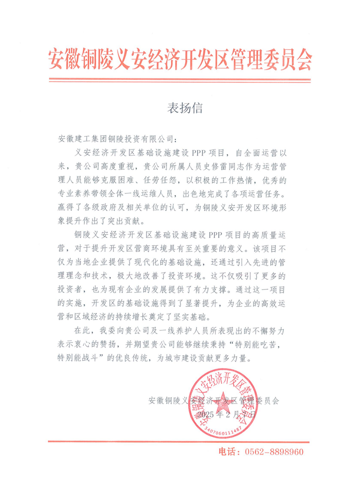 近期,建工投资铜陵PPP项目喜获铜陵市义安经济开发区管委会表扬。表扬信对项目运营团队在运营期间的出色表现给予高度评价,项目公司彰显的企业责任感、文化底蕴及良好形象获得属地政府和群众高度认可。