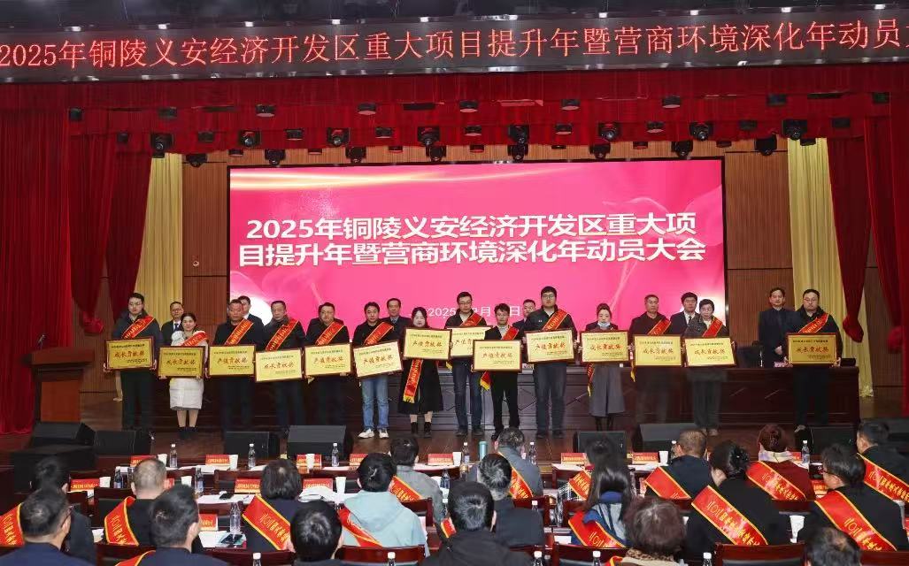 2月19日上午,铜陵义安经开区召开2025年义安经开区重大项目提升年暨营商环境深化年动员大会,重点表彰在义安经开区高质量发展中作出突出贡献的集体和个人,安徽建工长江建设投资有限公司现场获颁“2024年度义安经开区高质量发展产值贡献奖”。
