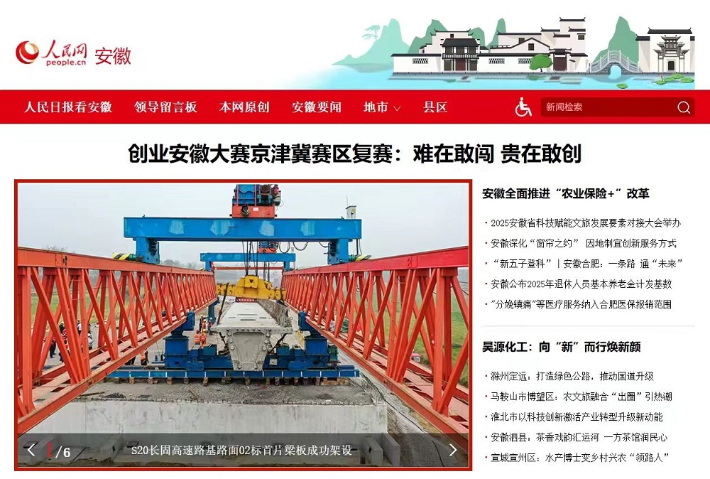 2025年10月15日,建工建投集团S20长固高速路基路面02标首片梁板成功架设。人民网记者深入项目一线展开报道,稿件登上人民网安徽频道首页。