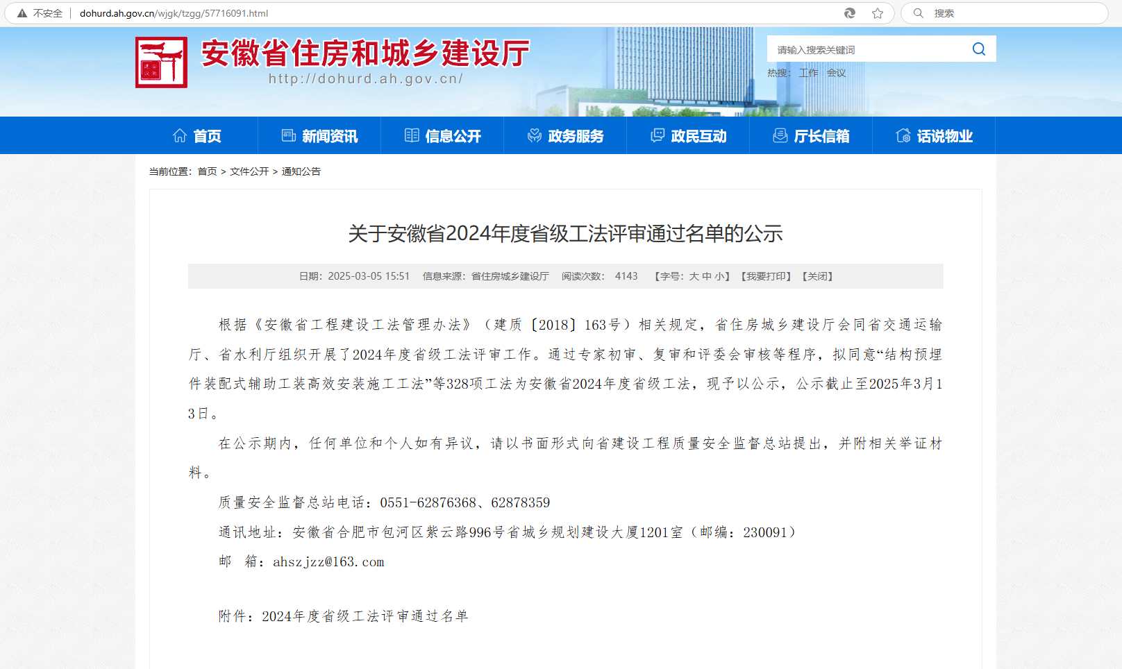 安徽省工程建设工法是全省工程建设领域的重要技术创新成果,以工程为对象,以工艺为核心,运用系统工程原理,把先进技术和科学管理结合起来,经过一定工程实践形成的综合配套的施工方法,体现了当前建筑业绿色化、智能化、工业化的发展趋势。