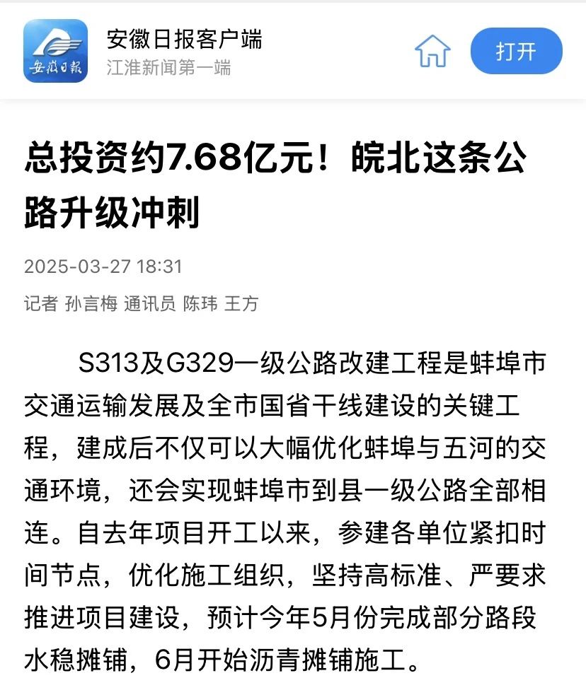建工水利承建的S313及G329一级公路改建工程建设稳步推进,预计今年5月份完成部分路段水稳摊铺,6月开始沥青摊铺施工。工程建成后不仅可以大幅优化蚌埠与五河的交通环境,还会实现蚌埠市到县一级公路全部相连。