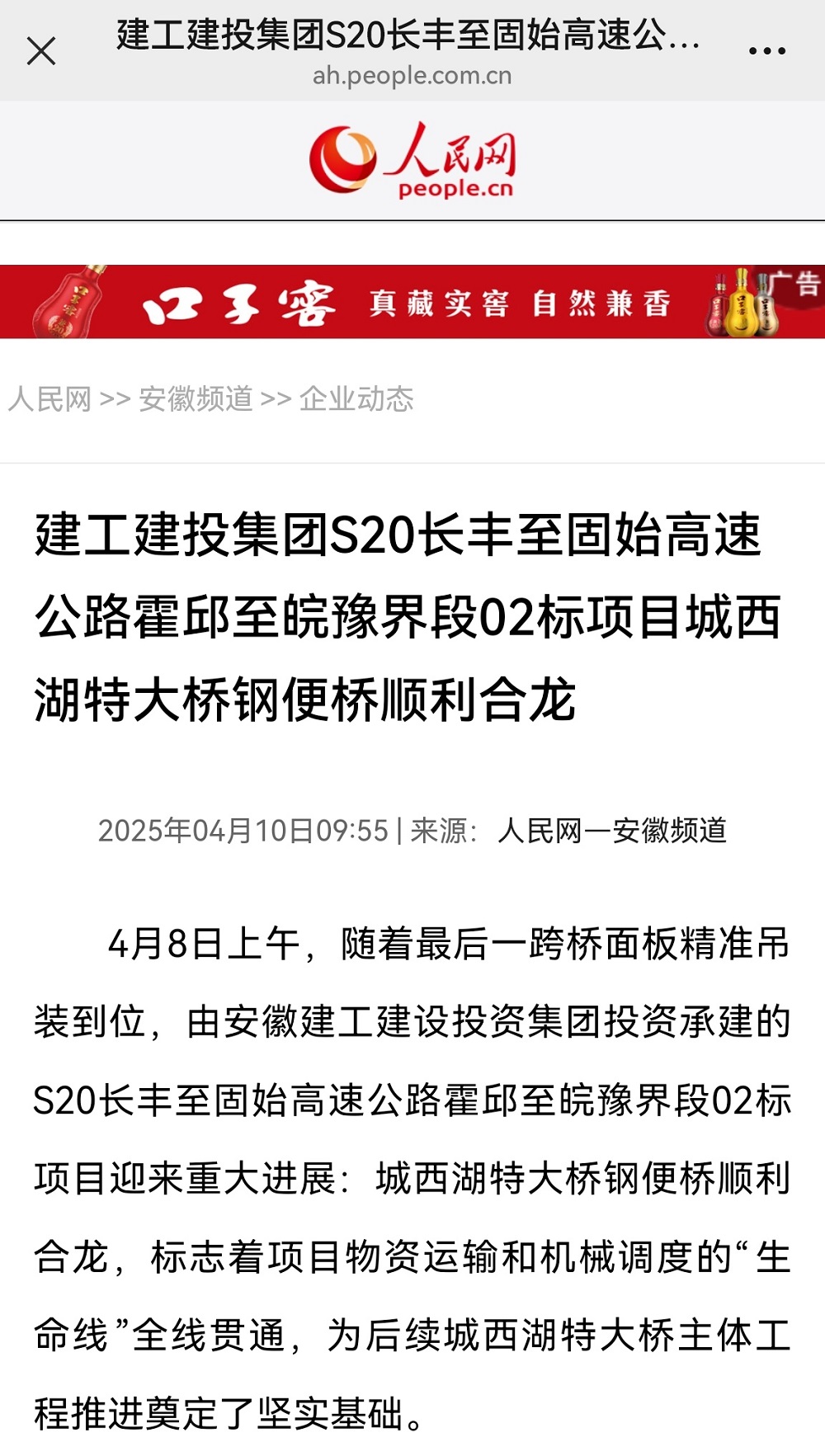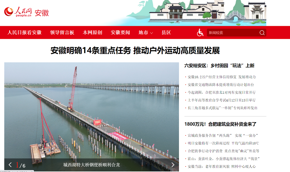 4月8日,建工建投S20长丰至固始高速公路霍邱至皖豫界段工程路基路面02标城西湖特大桥钢便桥顺利合龙贯通。人民网、《市场星报》深入项目一线展开报道,稿件登上人民网安徽频道首页。