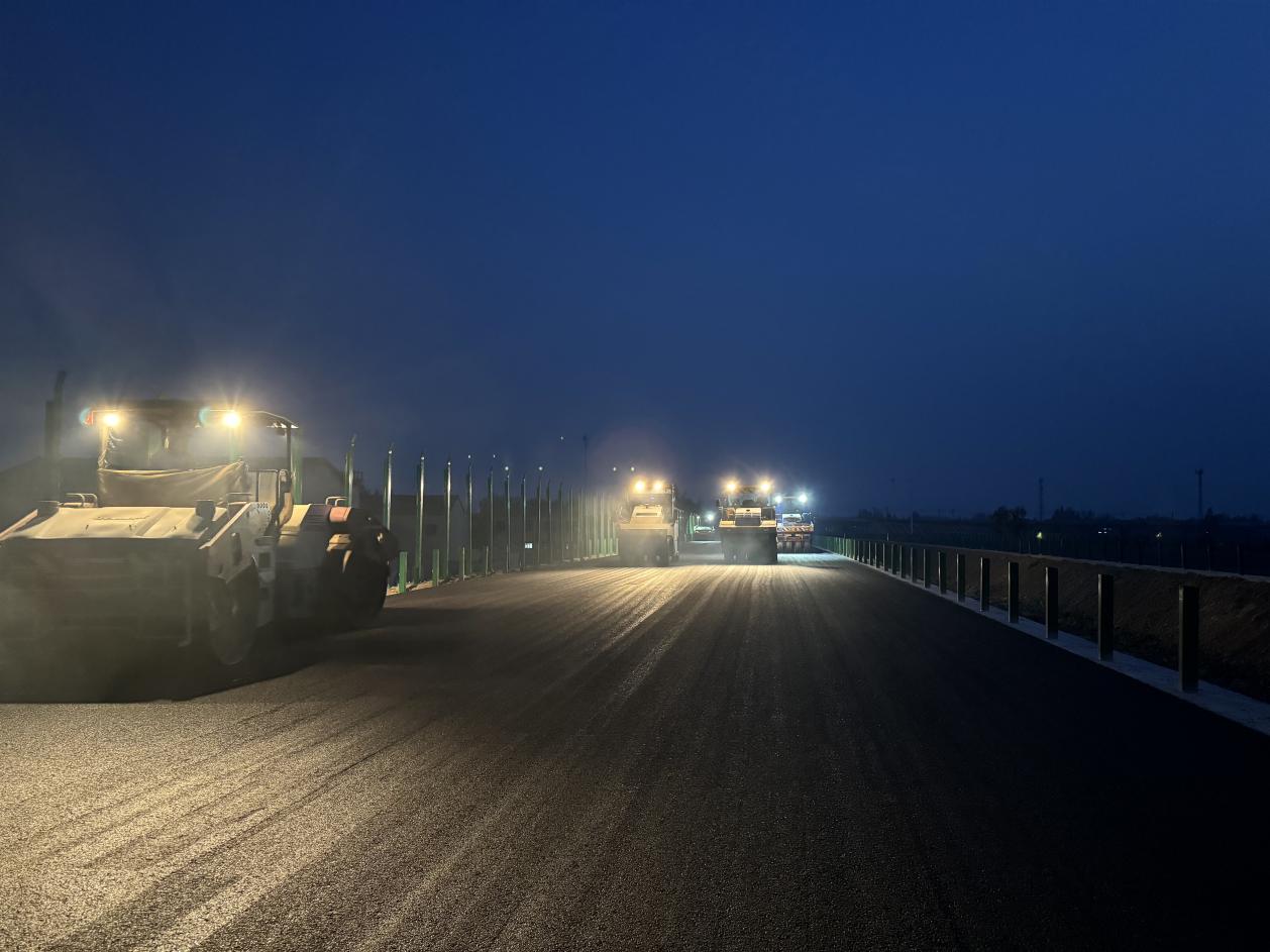 面对地方协调、交叉施工、恶劣天气等不利因素,项目团队积极与当地政府单位沟通,迅速调整施工计划,组织多班组交叉作业,党员团员带头加班加点,日夜奋战在施工一线,自2024年10月至今,水稳层完成总工程量的83%,沥青摊铺完成总工程量的90%,以高效施工全力推进项目建设。