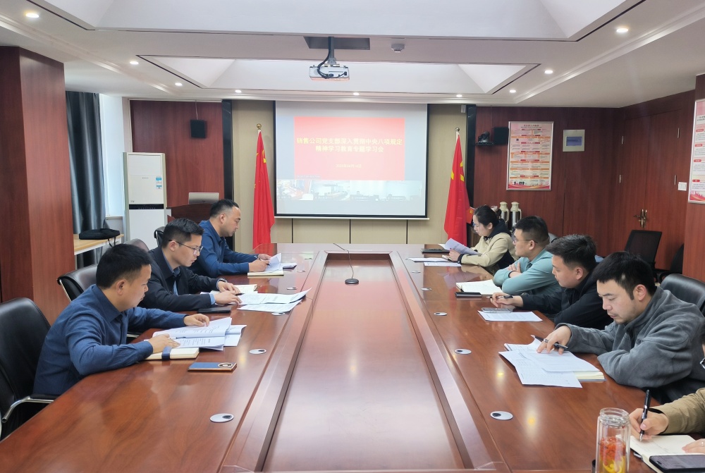 销售公司党支部召开深入贯彻中央八项规定精神学习教育动员部署会,传达学习习近平总书记关于加强党的作风建设的重要论述,中央及省委、上级党委党的建设工作领导小组会议和有关文件精神。会议要求,坚持聚焦主题、简约务实,融入日常、抓在经常,一体推进学查改;要开展形式多样的廉洁教育活动,在深学细悟中筑牢思想防线,在刀刃向内中找准问题症结,在动真碰硬中净化政治生态,将中央八项规定精神内化于心、外化于行,全方位推动公司在合规、高效、廉洁的轨道上稳健前行。