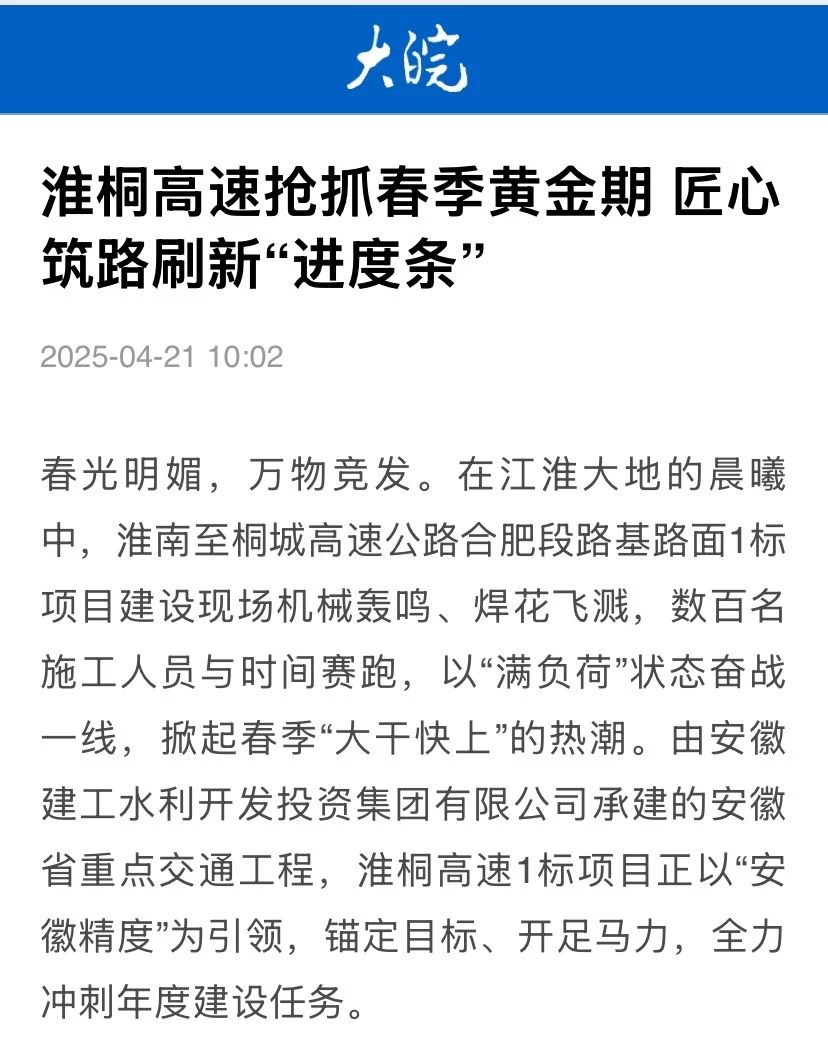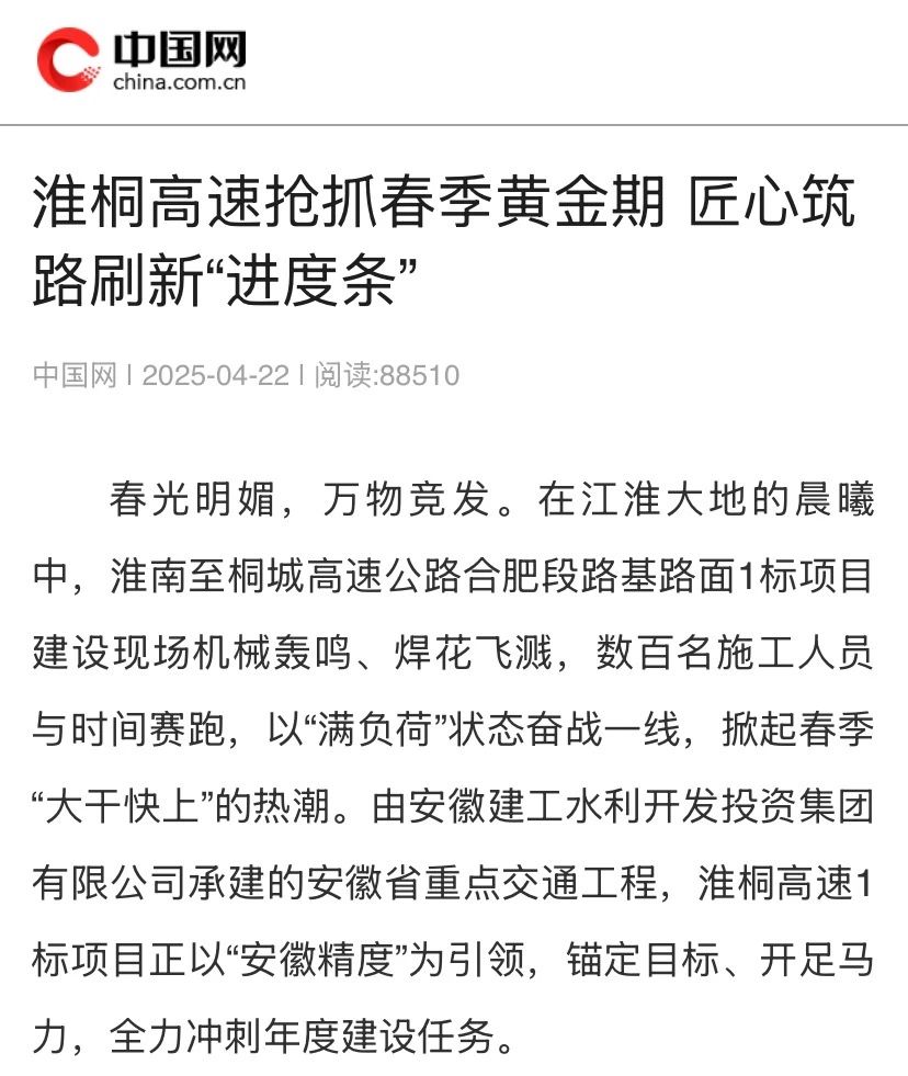 建工水利淮南至桐城高速公路合肥段路基路面1标项目建设现场机械轰鸣、焊花飞溅,数百名施工人员与时间赛跑,以“满负荷”状态奋战一线,掀起春季“大干快上”的热潮,全力冲刺年度建设任务,受到中国网、大皖新闻等主流媒体关注报道。
