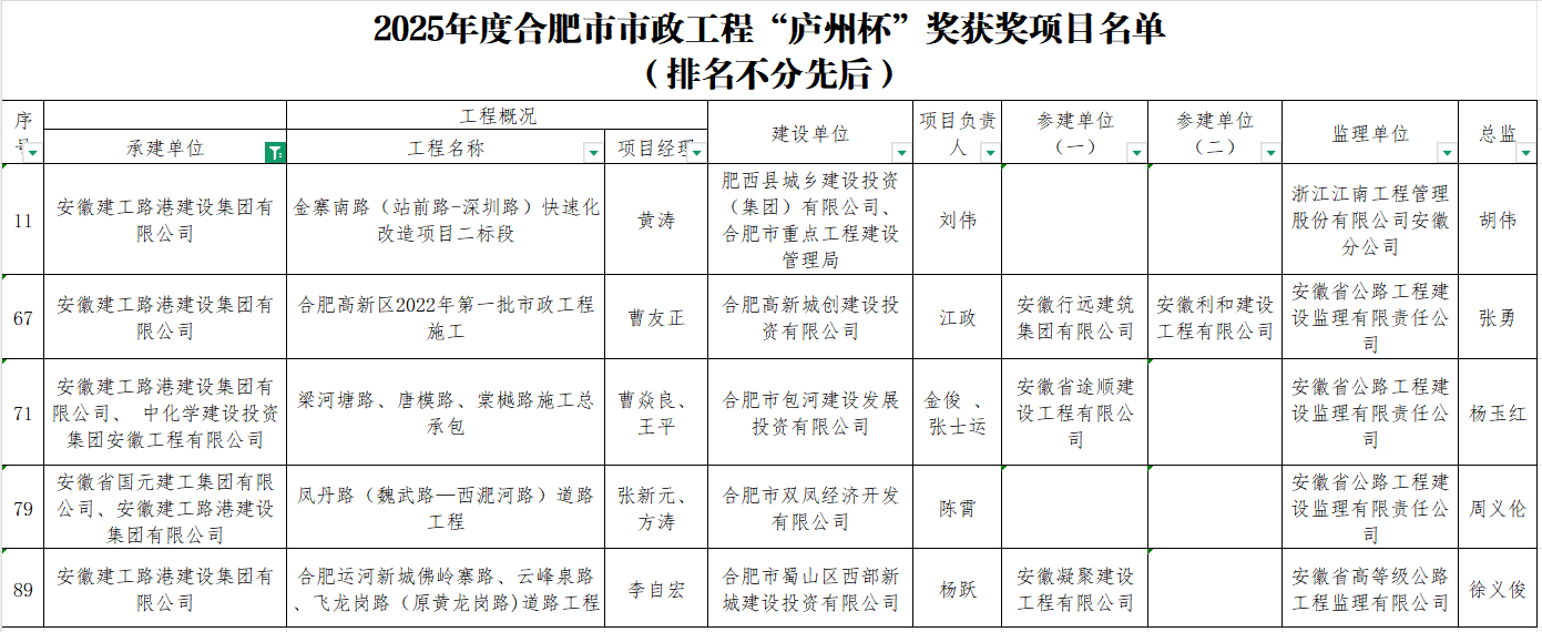 近日,合肥市市政工程协会正式公布《关于2025年度合肥市市政工程“庐州杯”奖获奖项目名单的通知》,建工路港五个项目荣获该奖项。