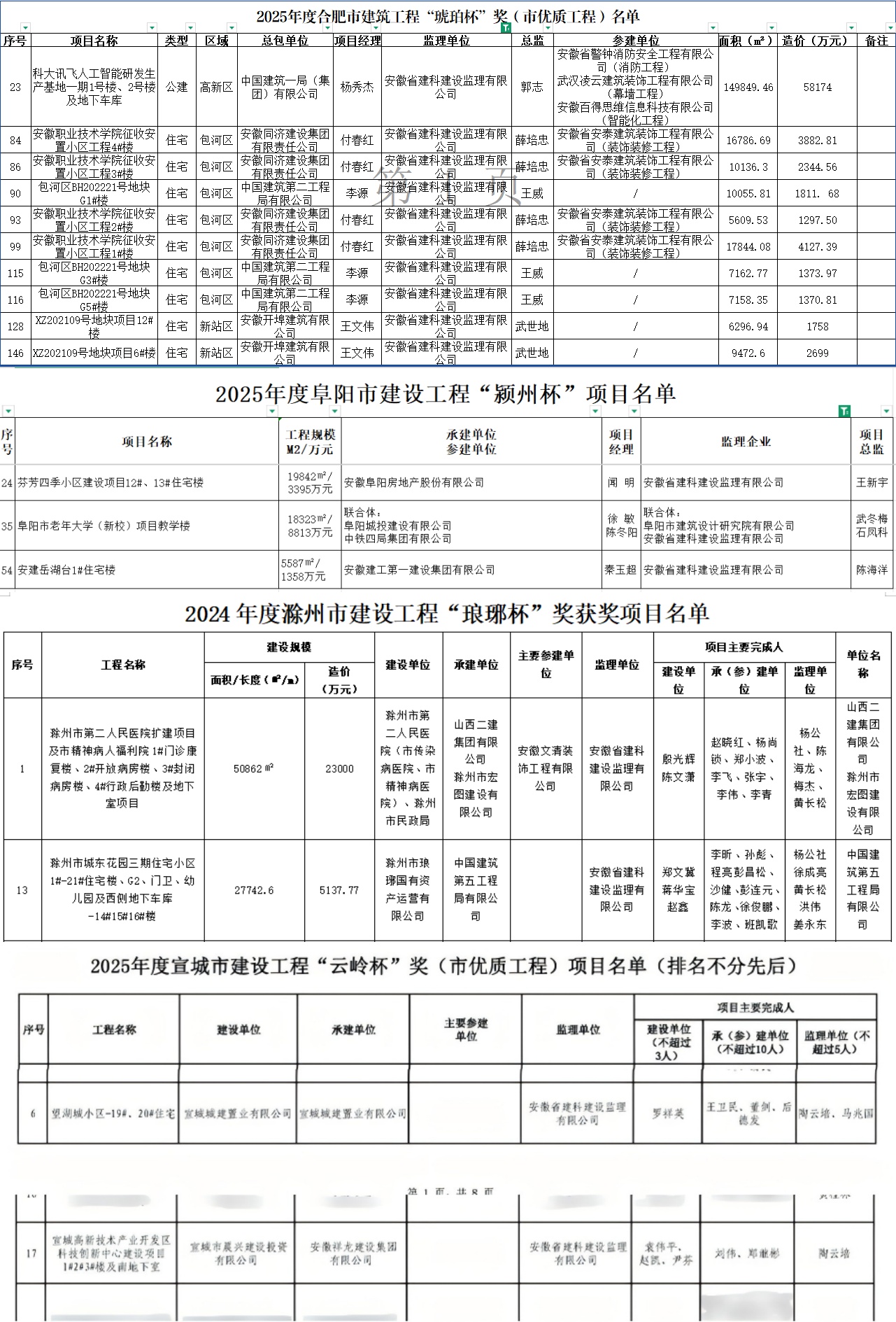 近日,安徽省建科院多个项目获得"琥珀杯""颍州杯""琅琊杯""云岭杯"四项优质工程奖项,彰显了我院在建筑工程领域的卓越实力。