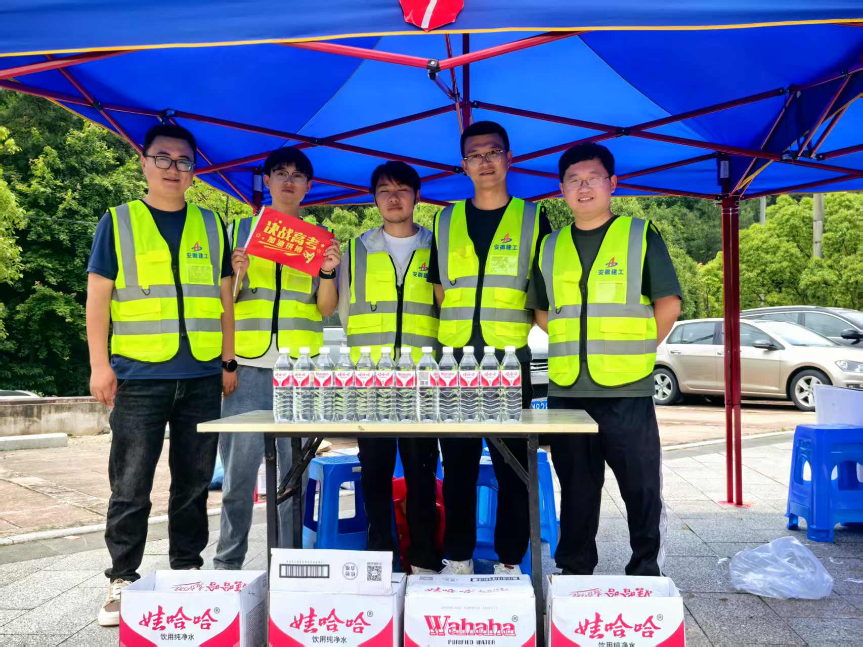 高考首日,在万千学子奔赴人生重要考场的同时,身着志愿服务红马甲的建工投资公司员工们也忙碌在护考、助考第一线。考点外,印有“安徽建工爱心助考服务站”字样的帐篷成为一道亮丽的风景线。项目志愿者们早早集结,精心布置起这方温馨的“爱心驿站”,免费为考生和家长提供矿泉水、纸巾、雨伞、扇子等物品。为服务岳西考生,岳西“两校”项目公司联合岳西县委党校为考生和家长提供交通疏导、指引,同时开放岳西县委党校部分区域为考点外等候的家长提供休息区。