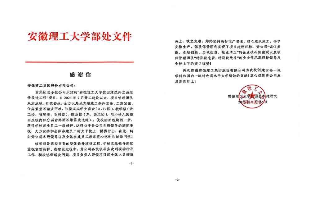 近日,安徽理工大学给安徽建工集团发来感谢信。信中对建工总承包公司精心组织施工、科学安排生产、高标准高质量完成安徽理工大学校园建筑外立面维修改造工程项目给予好评,对安徽建工集团助力其创建世界一流学科和国内一流特色高水平大学表示感谢。